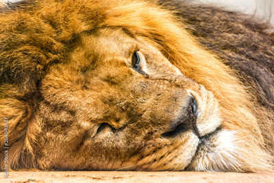 Close up portrait of sleepy lion. Wildlife animal in Africa