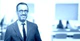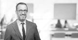 Teacher man using glasses confident and happy with a big natural smile laughing at classroom