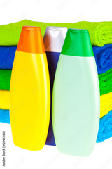 Bottles of shampoo and colour terry towels