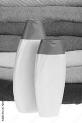 Bottles of shampoo and colour terry towels