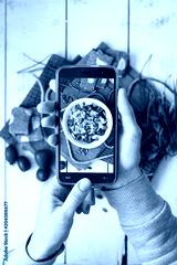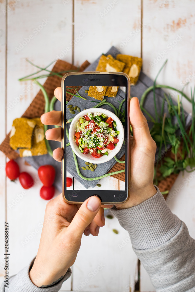 Phone photography of food. Woman hands take photo of lunch with smartphone for social media. Fresh vegetables salad. Raw vegan vegetarian healthy dinner