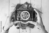 Phone photography of food. Woman hands take photo of lunch with smartphone for social media. Fresh vegetables salad. Raw vegan vegetarian healthy dinner