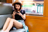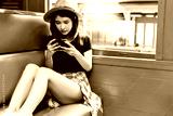 Charming beautiful woman is looking photos at camera during train is parking at a train station. Lovely girl sit on a vintage chair. She gets chep cost or ticket of train or transportation. copy space