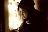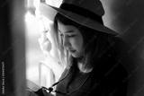 Portrait charming beautiful woman is looking at her camera. Beautiful girl stand on a train near exit. Attractive woman is a traveler. She loves travel at famous tourism location by using retro train