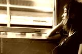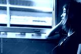 Portrait charming beautiful lovely woman. Attractive girl is listening sad music that make her feeling lonely, sad and miss someone. Pretty girl travel alone and look outside a retro train. copy space