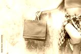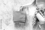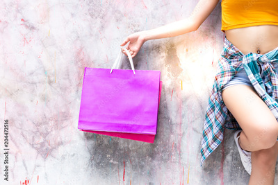 Charming beautiful sexy woman is holding and showing shopping bags. Attractive girl loves shopping. Gorgeous woman wears denim shorts. The copy space can put text, brand, product, goods at the bag