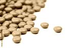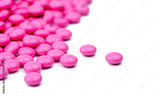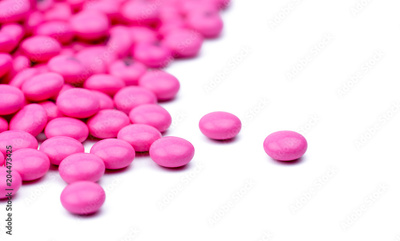 Closeup pile of pink round sugar coated tablets pills isolated on white background with copy space. Amitriptyline medicine for treatment anti-anxiety, antidepressant and migraine headache prophylaxis.