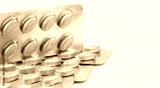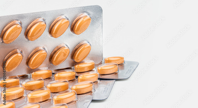 Orange oval tablet pills isolated on white background. Medicine for treating venous circulation disorders (swollen legs, pain, restless legs) and hemorrhoids and acute hemorrhoidal attack.