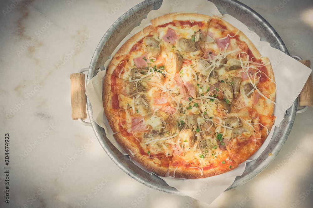 pizza served on marble table