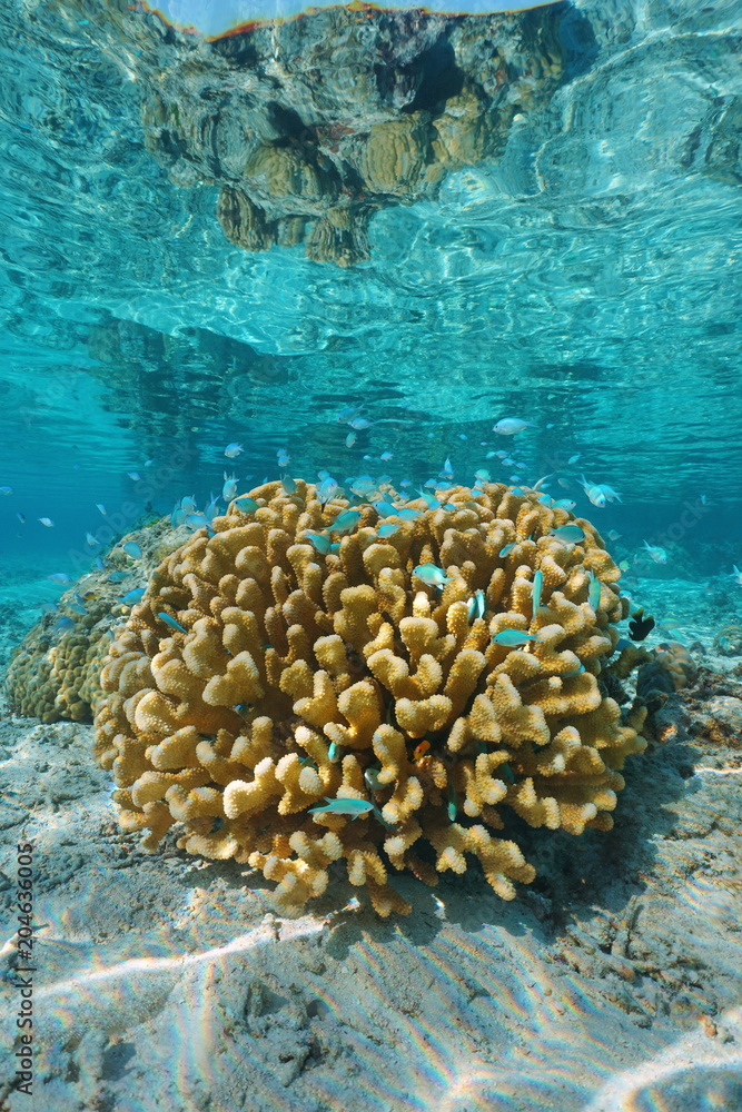 Cauliflower coral with blue-green chromis fish underwater, Huahine lagoon, Pacific ocean, French Polynesia