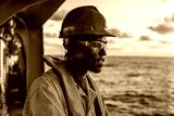 Tired Seaman AB or Bosun on deck of vessel or ship , wearing PPE personal protective equipment - helmet, coverall, lifejacket, goggles. Safety at sea