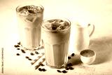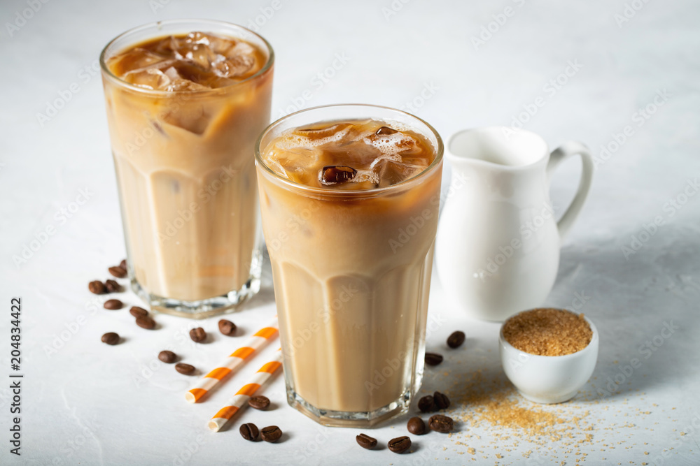 Ice coffee in a tall glass with cream poured over and coffee beans. Cold summer drink on a light blue background