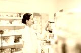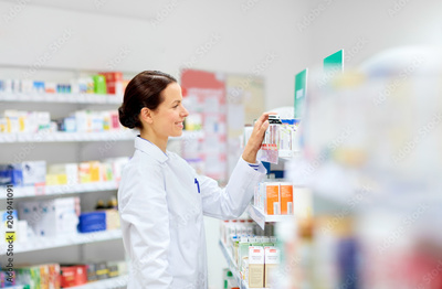 medicine, pharmaceutics, healthcare and people concept - happy female apothecary taking drug from shelf at pharmacy