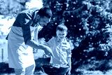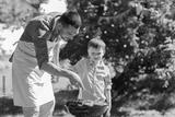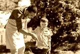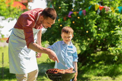 food, people and family time concept - father and son cooking meat on barbecue grill at bbq party in summer garden