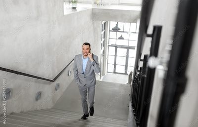 business people, technology and corporate concept - businessman calling on smartphone at office