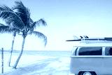 vintage car parked on the tropical beach (seaside) with a surfboard on the roof - Leisure trip in the summer. retro color effect
