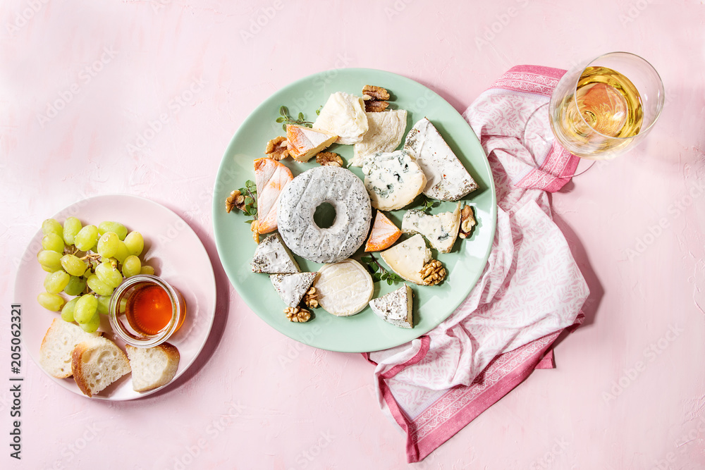 Cheese plate assortment of french cheese served with honey, walnuts, bread and grapes on turquoise ceramic plate and glass of white wine over pink pastel background. Top view, space.