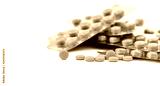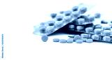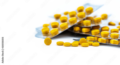 Selective focus on yellow tablets pill on blurred background of blister pack of round yellow pills. Diclofenac medicine for arthritis, painkiller, gout attack, rheumatoid pain. Pharmaceutical industry