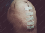 Replacement knee surgery operation on senior or elderly old man patient after knee surgery one week passed.