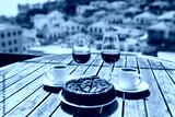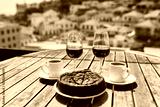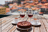 Madeira wine, coffee and hohey cake, View to Funchal, Portugal