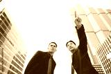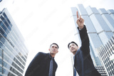 Handsome businessman is asking the way in the big city or metropolis and Attractive elder businessman is telling the way to go by pointing his finger to the destination with high building background