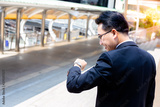 A handsome businessman is looking wristwatch for checking time. Handsome guy feels happy when he comes to meeting point and has ample time. He feel relieved. He wears full suit. space, city background
