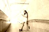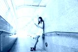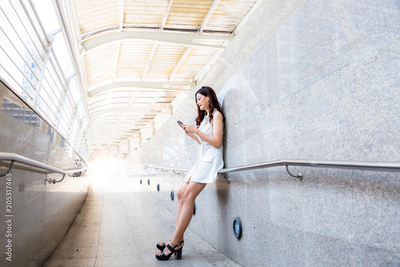 Charming beautiful asian woman. Attractive beautiful girl is listening nice music by using smartphone, earphone at walkway while waiting her boyfriend that makes her feel relaxed and happy. copy space