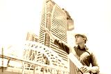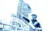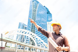 Handsome worker or engineer man is pointing finger, looking to copy space. Employee hold blueprint. Asian guy look determined and confident. He wear hard hat for safety at workplace. city background