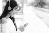 Charming beautiful teenager woman is enjoying life by listen nice music. Pretty girl look at smartphone and finding her favorite music. She wear headphone. Lovely young girl has nice smile. copy space