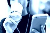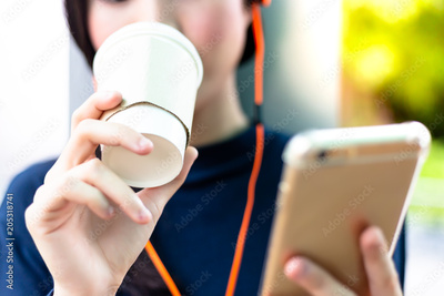 Portrait enjoy drinking coffee woman. Charming beautiful woman hold a cup of coffee, listen music. Pretty girl gets satisfied the taste of coffee that has nice smell, delicious. She is drinking coffee