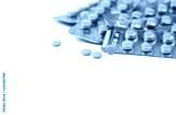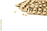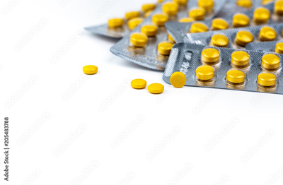 Selective focus on yellow tablets pill on blurred background of blister pack of round yellow pills. Diclofenac medicine for arthritis, painkiller, gout attack, rheumatoid pain. Pharmaceutical industry