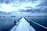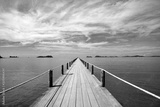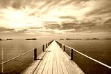 Black and white Landscape of wooden bridge in blue sea on tropical beach .