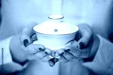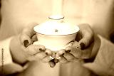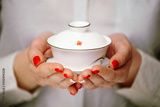 Cropped shot of woman holding porcelain chawan in front of the camera.