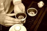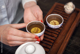 Cropped shot of woman holding traditional chinense teacup with oolong green tea.