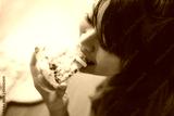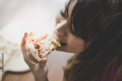 A beautiful woman is holding a piece of pizza and eating it. Pretty asian girl feels happy and enjoy eating the pizza. It looks so delicious or yummy. Lovely girl get satisfied taste with copy space