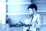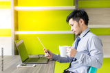 Portrait working handsome businessman. Charming handsome business men reading news on tablet. Attractive guy drink coffee in morning before working. Asian man is expert or professional of financial