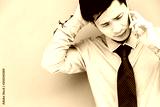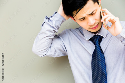 Handsome businessman gets upset and unsatisfied, his customer or employee cheats him. Charming man talk to customer, employee by using mobile phone. Attractive asian guy feel bored, unhappy copy space