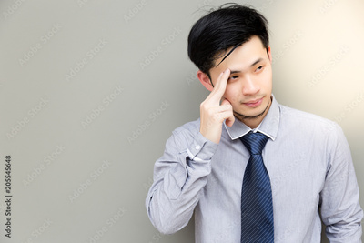 Portrait charming handsome businessman: Attractive guy is thinking how to do his best of working. Asia man looks so smart. Asian guy wears necktie and shirt. Handsome business man has beard, mustache