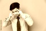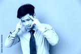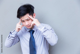 Portrait stressed businessman: Attractive guy gets headache because charming handsome business man work too hard and get stressed or asian guy get office syndrome that makes him painful, copy space