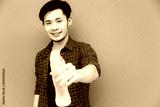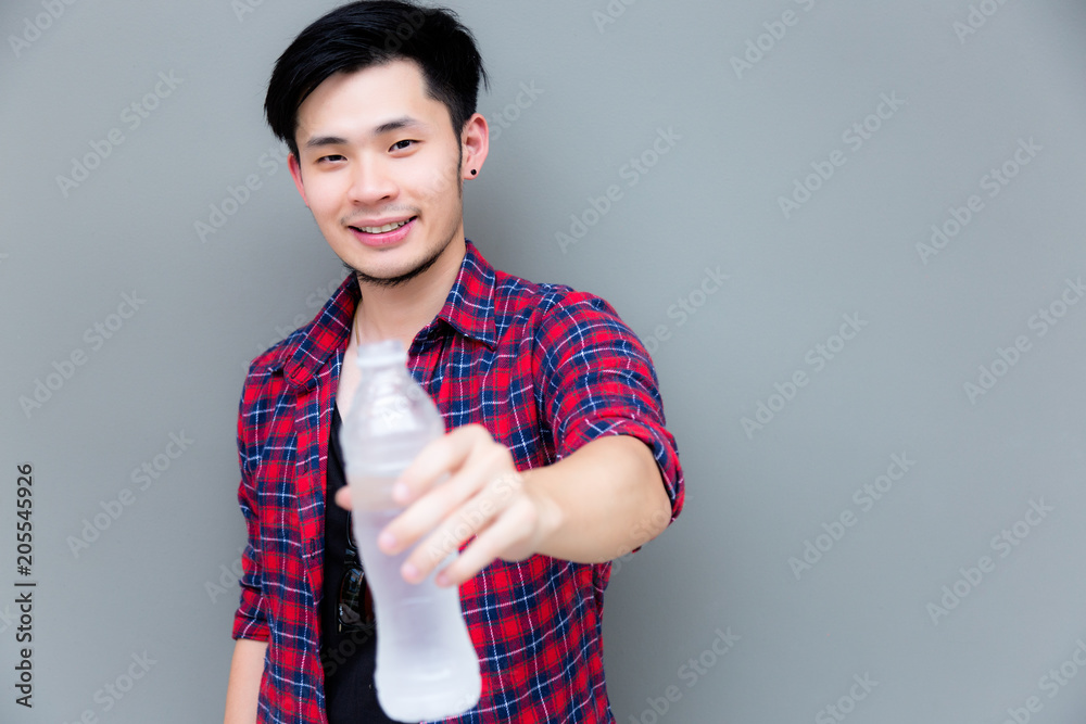 Handsome young man is satisfied mineral water or pure water. Asian handsome guy acts like a invite someone to drink water for getting good health and feeling fresh. Attractive man loves drinking water
