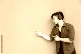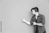 Portrait charming handsome worker guy: Attractive man wants or need something. Handsome cool guy is pointing fingers to his favorite things or copy space. Lovely man acts like a showing something