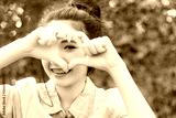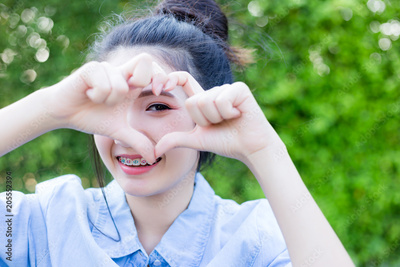 Portrait pretty asian girl: Glamour woman makes her hands like a heart. Charming girl make symbol of love and gives it to someone or customer. Gorgeous lady look happy with bokeh and green background