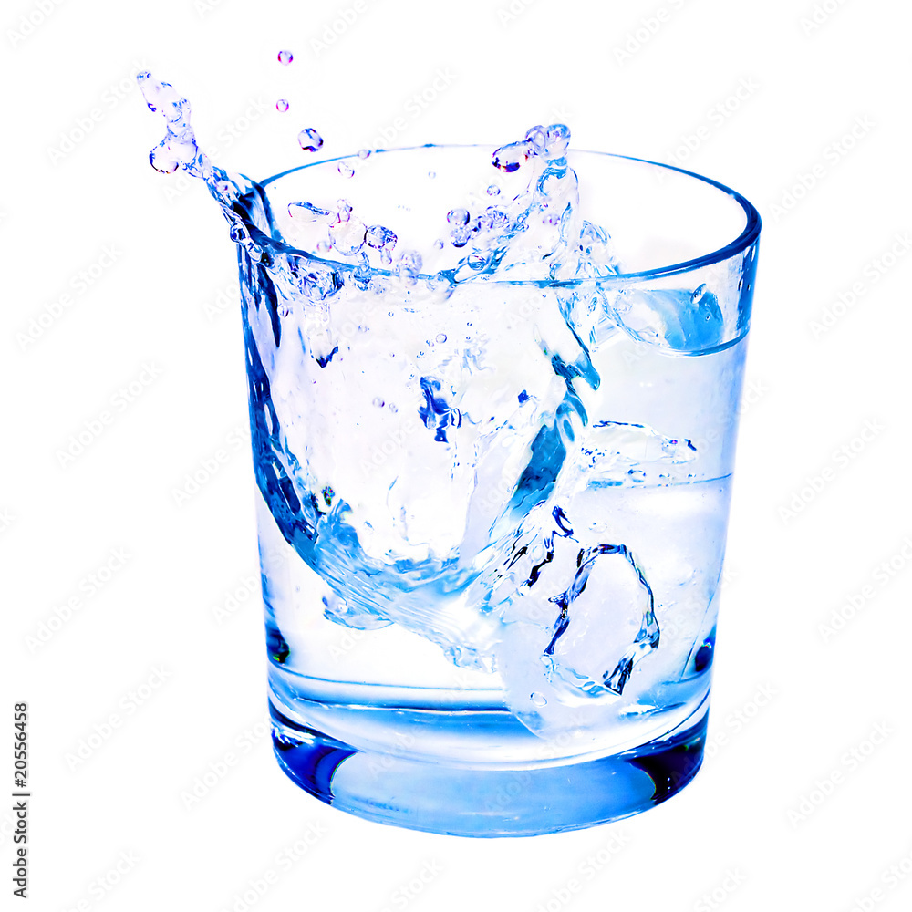 Isolated shot of water or alcohol splashing from a dropped ice c