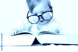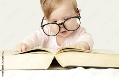 Adorable baby in front of big thick book, studio shot