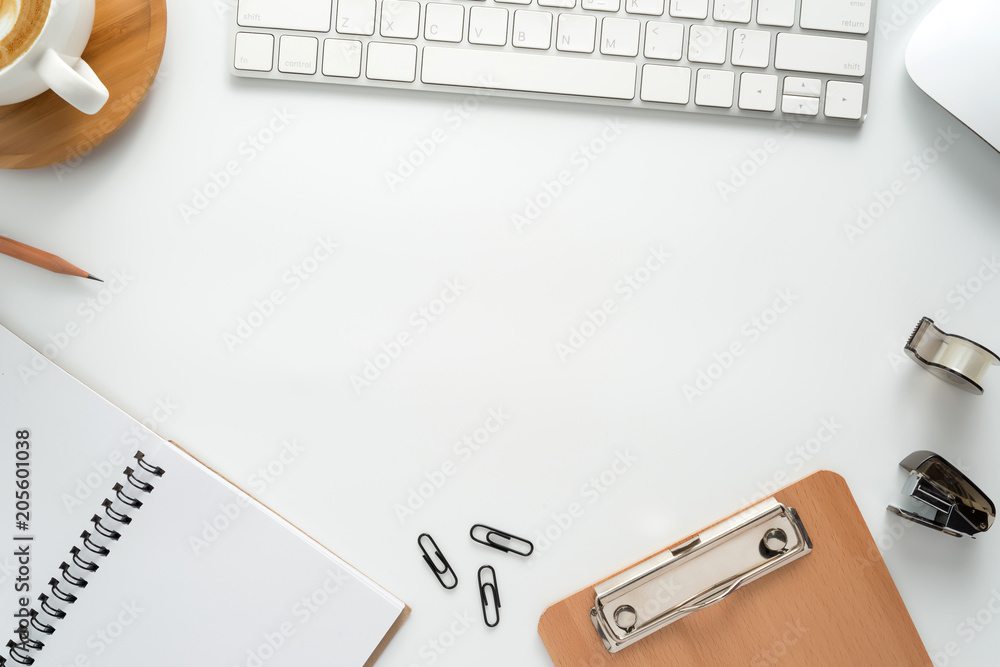 Flat lay, top view office table desk. Workspace with blank note book, keyboard, office supplies and coffee cup on white background.