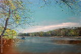 Fisherman on a boat in early spring. Painting. Landscape by the river. Oil painting river in Europe.