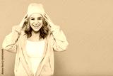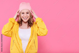 Beautiful hipster teenage girl in bright yellow jacket and pink beanie hat super excited. Attractive cool young woman fashion portrait over pastel pink background.