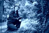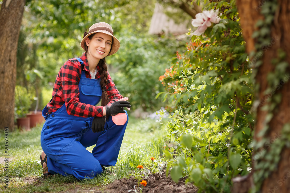 female gardener in work clothes with spray bottle