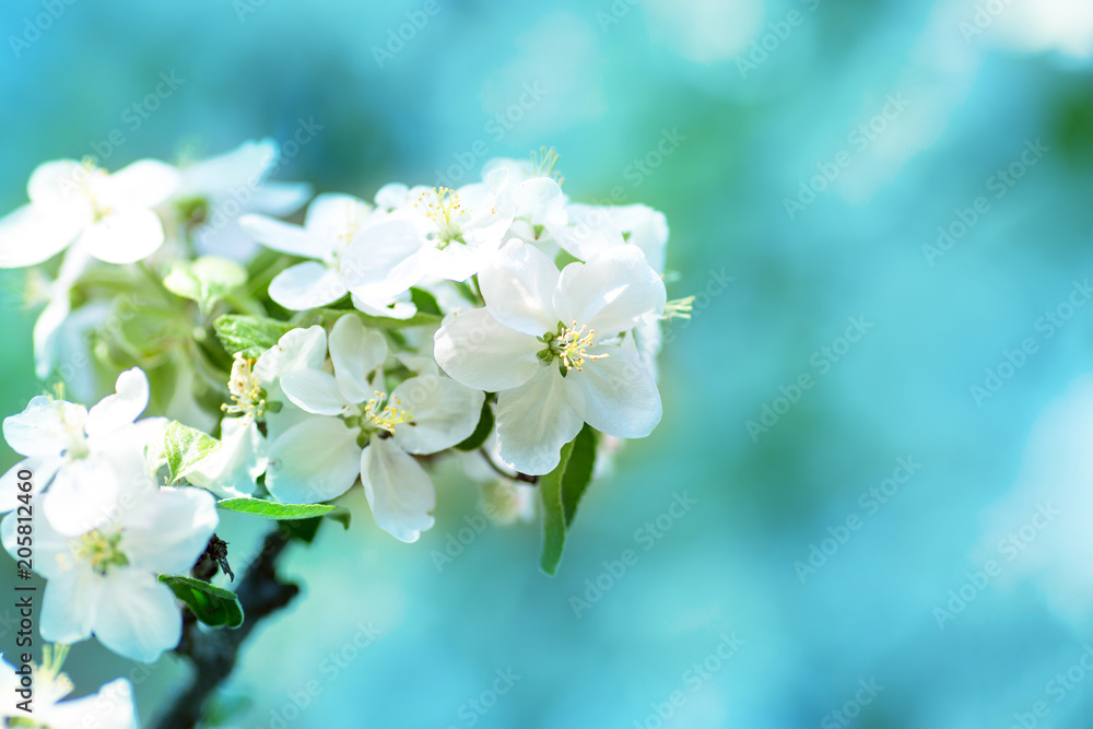 Beautiful floral spring abstract background of nature. Branches of blossoming apple tree light blue sky background. Copy space. Nature background.