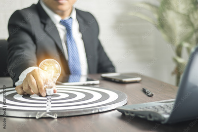 Idea concept,Businessman holding light bulb on dart board to goal